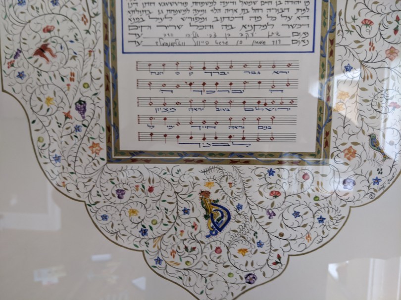I feel terrible that my image quality is so bad, but I just snapped these from the wall. My husband and I designed this with our artist, Laya Crust, who perfectly understood our taste, and also the importance of music in our lives. Yes, the first image shows musical notation at the bottom: that’s the music of Salamone Rossi (sorry, that’s a wikipedia link, but if you have access you can find out more on the Grove), an Italian Jewish violinist and composer. He composed music to the psalms (tehilim, in Hebrew) and we chose a quote along with his music to put into our ketubah.