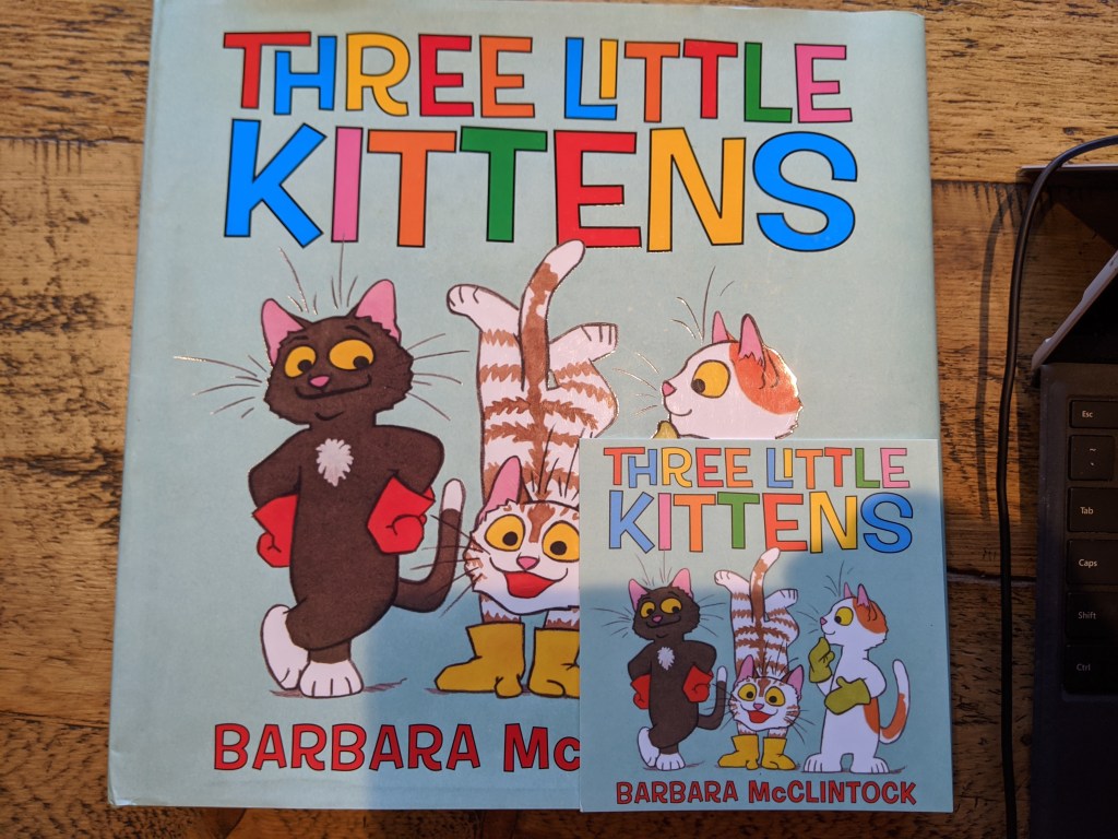 One of the books that came out during the most miserable point in the pandemic (which is to say, the point during which I couldn’t visit inside book shops or even get curbside pickup– and I was glad not to do so since I wanted to help keep everyone safe, but it was miserable, no denying it) was Three Little Kittens by Barbara McClintock.