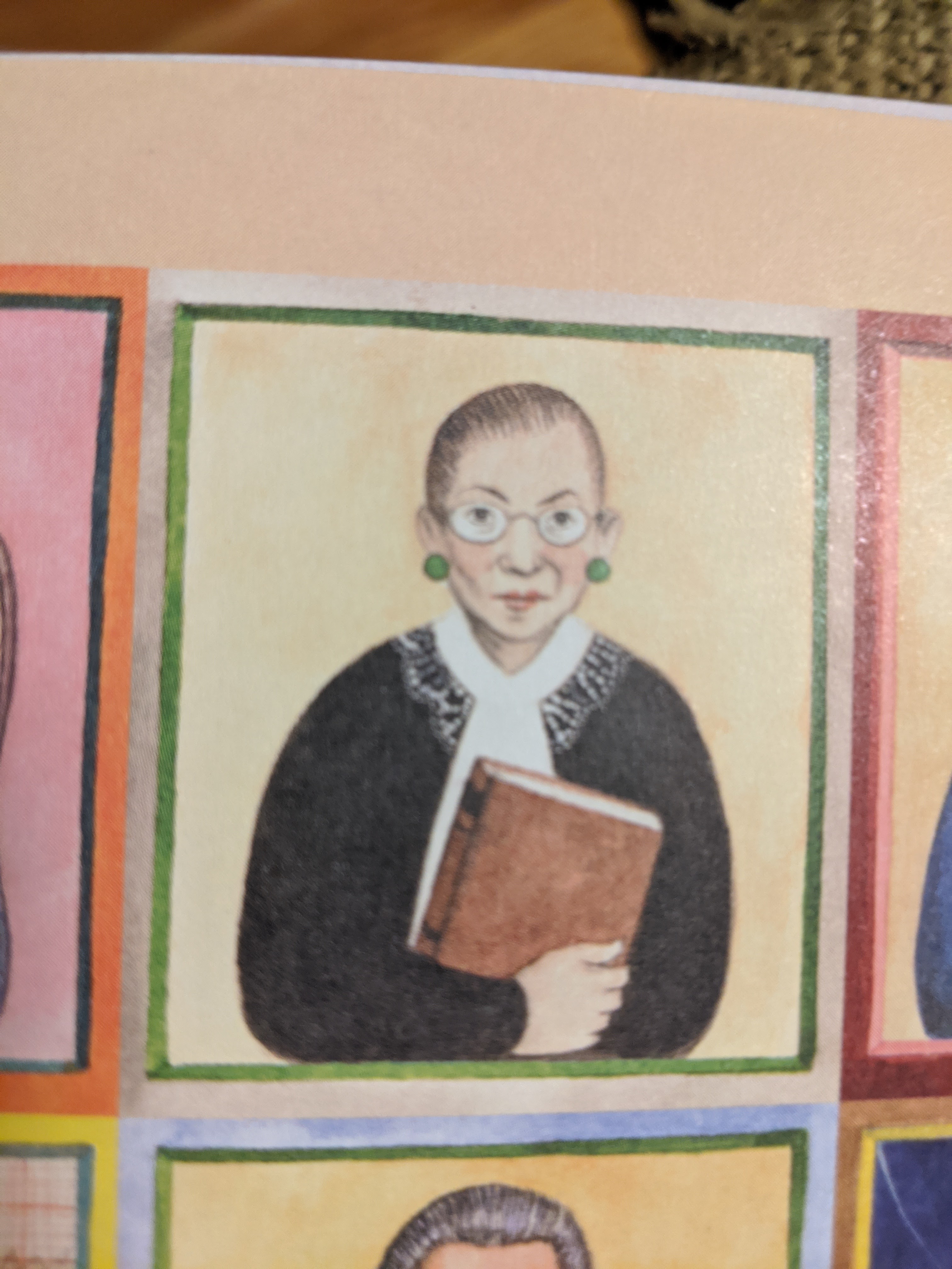 Thank heavens for Sophie Blackall. It’s a beautiful portrait, and captures her fierce intellect and dedication to her work. I pointed to the picture and told my girl about Ruth Bader Ginsburg, her career, her ferocious mind and will, and the devastating loss. I told her it was going to be a messy few months, having lost someone of her stature. I said if she was interested in learning more about her, I’d be happy to get one of the many beautiful books available for kids about her life and work.
