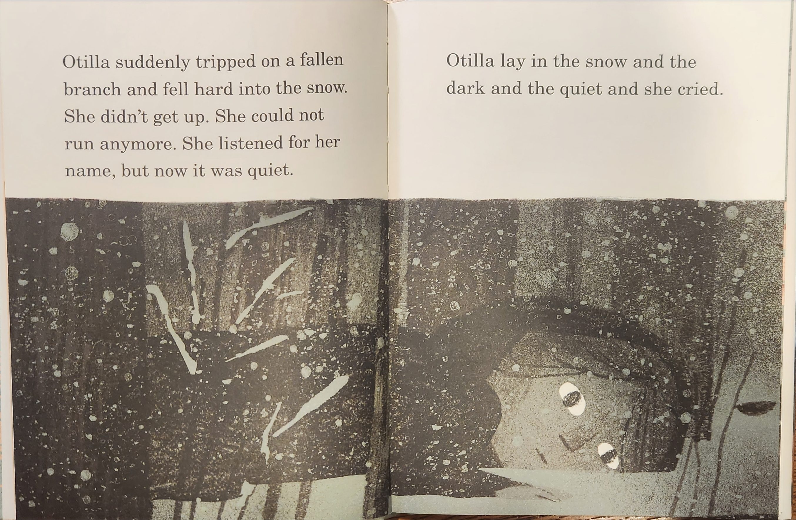 Otilla wasn’t afraid of the dark. We never do find out what she was running away from. I do know one thing, and it’s that there is one, and only one, page of the book that made my heart crack. Otilla falls in the snow, listening for her name being called, and cries, lying on the snowy forest floor, alone. The mother in me wanted to scoop her up in a hug. Otilla, though, cries until she’s finished crying, then gets up and goes on.