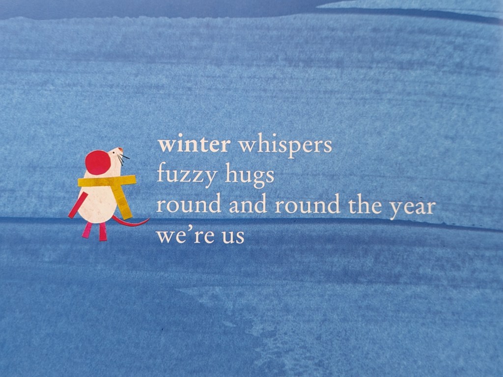 Rhyme is secondary, in a kid’s book, to metre, but it is not unimportant. And what you’ll notice in Round and Round the Year We Go is that for each month the form of the rhyme shifts, because, and I didn’t quite pick up on this one until I inadvertently bothered the editor of the book (who was super sweet about me thinking I’d written to Carter Higgins, who is just the loveliest person, but I had not and was very embarrassed to be badgering a person I’d never spoken to before!), and she mentioned that they’d worked on basing the rhyme around assonance with the name of the month. A fascinating concept! It gives each month a distinct form, of course, because each month’s name varies in syllabic and accentual construction, of course– January vs May. Yes, that’s all very technical, and I highly doubt that Carter Higgins was pacing her study muttering “Auuu-gust, Auuu-gust… A trochee, after the iambic Ju-LY! But the key will be a short o sound…” And yet, not only did she do that (not just short o, also a short i– I would never have thought of that, but it works brilliantly)– but she seems to have realized that by cleverly dodging a strict rhyme and adhering to a combination of assonance and metre, she could get to the heart of August best… through some delightfully, playfully grouchy superlatives: longest, hottest, and the delicious coinage wrongest. They aren’t really, strictly, perfectly rhyming, but they feel like double rhymes, they do, and the vocalic echoes and the added nasal element of “ng” evoke the dull, sticky dregs of August in a way I’ve never seen done elsewhere.