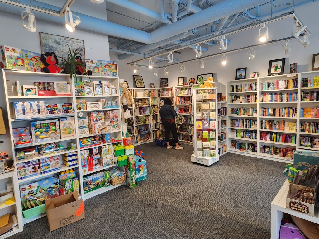 The two other big revelations to me on that trip were Woozles and Running the Goat. I was already in something of a long-distance relationship with both places. Woozles was known to me, of course, as the oldest children’s bookshop in Canada, but, more to the point, as the quiet label on the website says, it’s “a place for and about children.” Perfect. If children aren’t the point, it’s not at Woozles. As it should be. The place is open and cheery with a ton of wonderful art from local children’s book artists, some of the greatest, on the walls– the problem with writing so long after the fact is that I can’t remember them all! Lauren Soloy, Jon Klassen, I think Matthew Forsythe and– I can’t recall, I remember spinning around going “and LOOK! LOOOOOK!” a lot. My Spriggan, who was smaller then, fell passionately in love with the Very Giant Clifford plushie and the train table. My husband may possibly have stared at the counter at checkout and quietly asked if they had a box we could carry the books in. It was a bit of a situation. The local authors section– think of signed books from Lauren Soloy (with her charming doodles) and Sydney Smith who does the most beautiful miniature art in each volume he touches– more or less went home with me, but I’m sure they’ve restocked by now. The toy section is thoughtful and in no way overwhelms the books. I have mixed feelings about toys in book shops, but this section feels like it belongs there and enhances the “intelligently kid-oriented” atmosphere rather than simply caving to the inevitable drive towards merch rather than books. Above all: the booksellers! They are smart. They had a sense of what books my kids needed in about five seconds flat and, after quickly assessing the situation, let us do our browsing as well as offering thoughtful suggestions. They did not overwhelm us. I miss and will continue to miss my own beloved Children’s Book Shop forever, and this was a kind of stinging balm: a reminder of everything I loved, while also making me grateful that other places of equal quality, equally focused on providing children with good bookish spots, are still around. “What makes a good book shop?” Those smart, thoughtful booksellers go a long way towards answering that question, to my mind.