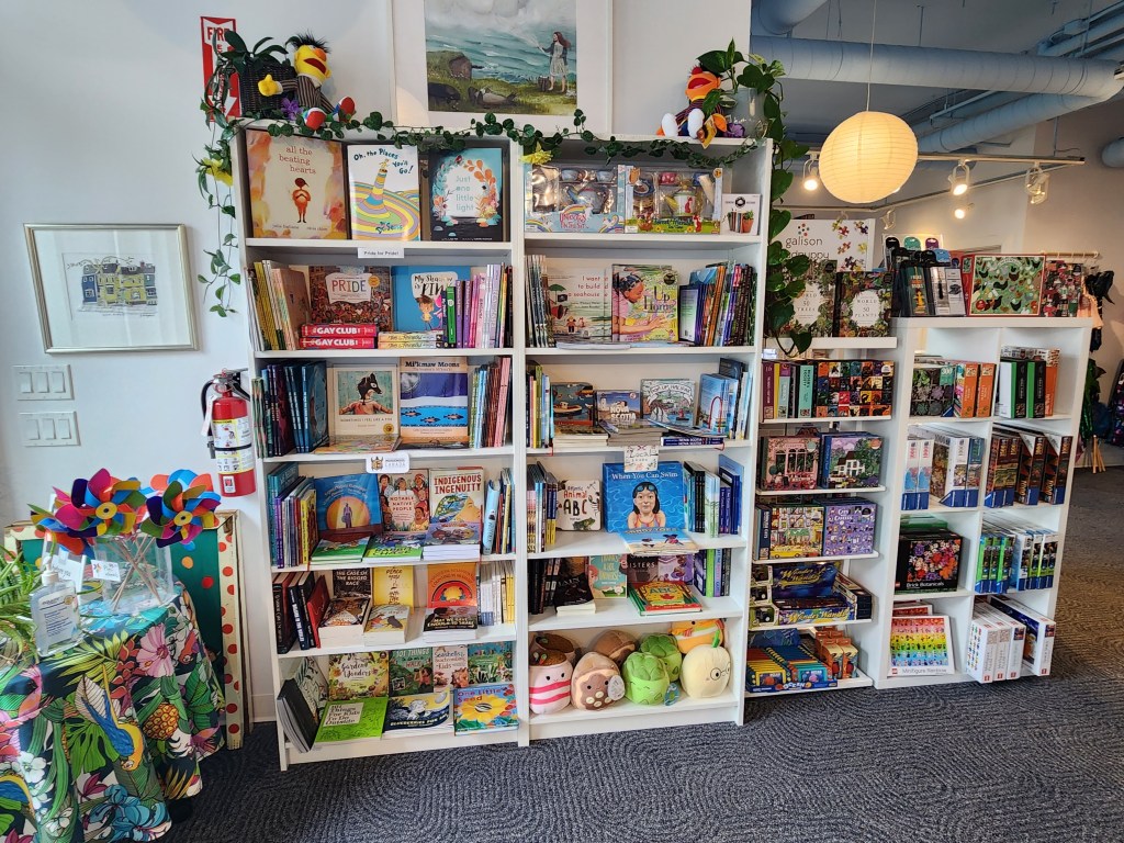 My first book shop growing up was Tidewater Books in Sackville, New Brunswick, a store that’s now moved from its original location and, through various twists and turns in shops in the town, now has a large gift section, but it’s still owned by Ellen Pickle and it’s still going strong. I remember my first solo purchase there: a pen with purple ink I thought was just the most sophisticated thing I’d ever seen. And I remember the last book I bought there before we moved to Toronto– my own paperback copy of Pride and Prejudice. Nostalgia can be a positive or a negative. I miss the old storefront, but I’m so glad the shop is still around, and that it still features local books prominently. The space is friendly, Ellen Pickle has good taste which informs the selections, and the store is engaged with the long story of the Maritimes. When I was there, the window display was filled with local Indigenous stories for National Indigenous Peoples Day. I have a feeling that, even if I weren’t so emotionally attached to the very name of “Tidewater Books,” I would still find a book to love on any visit.