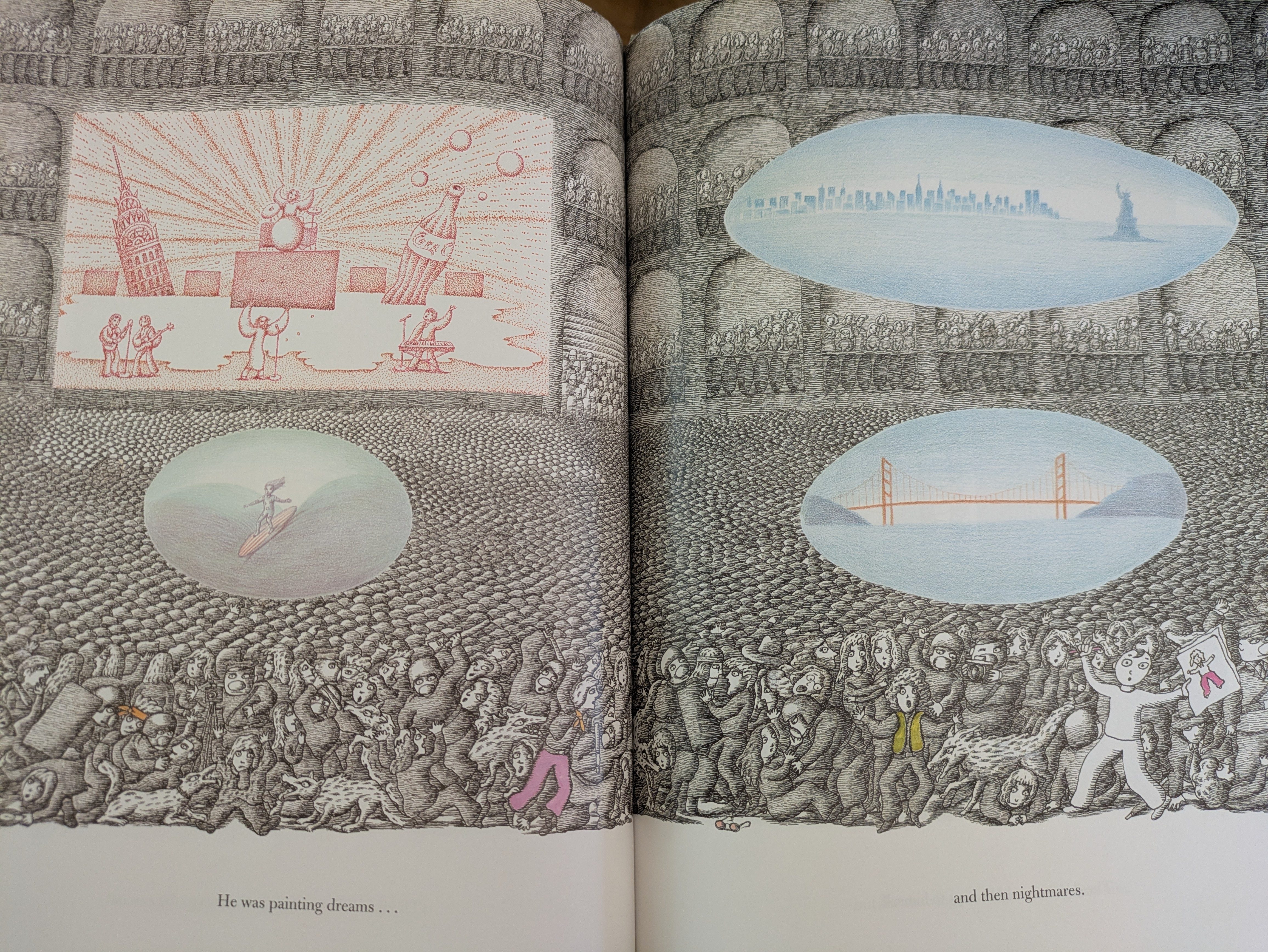 In The Wall, Peter Sís distills growing up under oppression, finding a secret voice, hiding it, and with wave on wave of growing pushes towards liberty from the Soviet regime, finally coming to freedom.